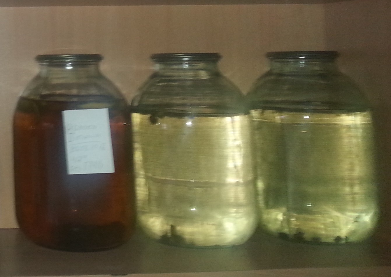 Я покупаю готовую дубовую щепу средней обжарки, она без угольков, но тоже неплохо меняет и вкус и цвет. Для изнеженных товарищей, добавляю немного апельсиновой цедры и чуть ванили, напиток приобретает особый, какой то немного освежающий аромат, но тут главное не переборщить. Лимон не люблю, в свое время продавалась лимонная водка, видимо перекушал ее. Раньше после первого перегона настаивал примерно месяц на различных травах и специях, после вторично перегонял, добавлял немного сахара и получал довольно ароматные напитки с различными вкусами, сейчас как то больше предпочитаю просто настоять с щепой. К моему стыду должен признать, ни разу не ставил обычную сахарную брагу, только плодово-ягодные и зерновые. На фото три банки с яблочным самогоном, слева одна прошлогодняя, справа две свежие, во все банки добавлено по 6 гр. щепы. Какой приобретается цвет хорошо видно.