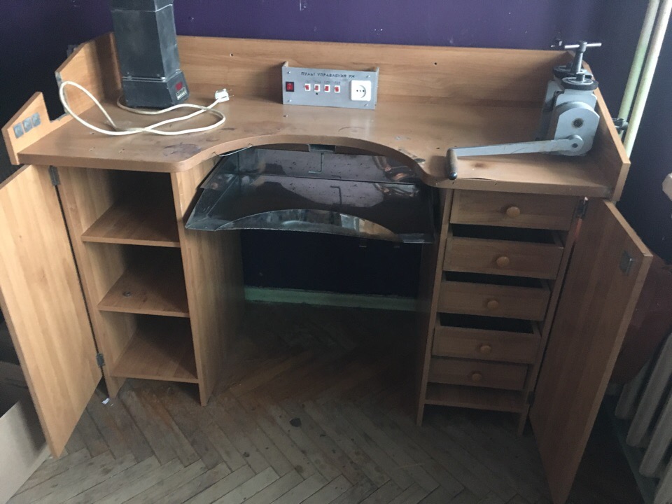 Состояние удовлетворительное (столешница несет следы работы,на левой стенке сделан вырез для небольших валов. В остальном состояние идеальное). Если надо, в комплекте единый выключатель для освещения, горелки, лампы микроскопа и т.д.