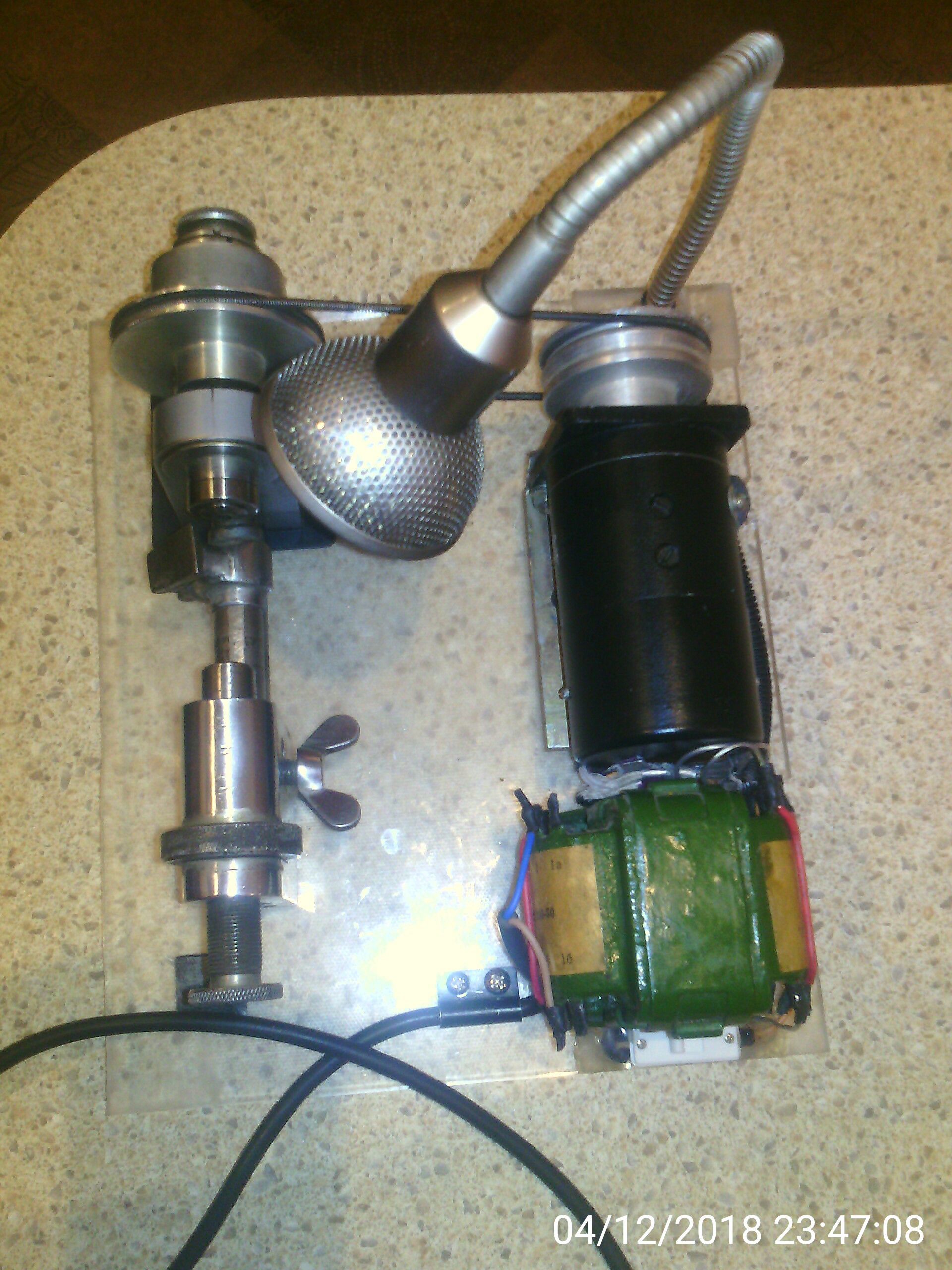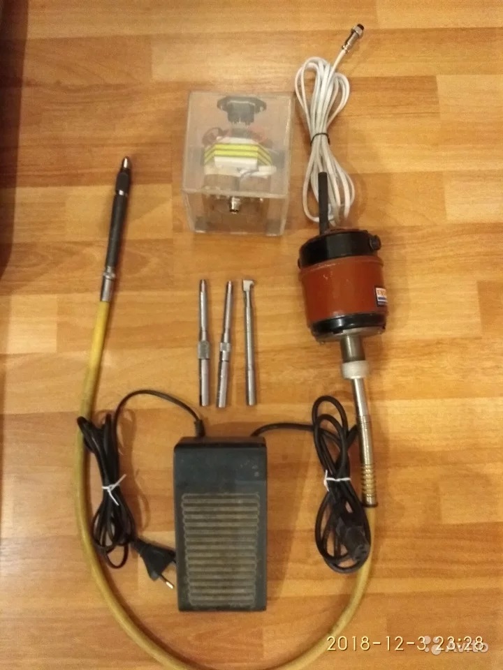 бормашина с 4мя сменными наконечниками(серый на 30000 оборотов) , низкие обороты ,педаль ,совковый надежный трансформатор с диодным мостом. В корпусе из оргстекла и резиновыми ножками.Двигатель для работы в запыленных и повышенной влажности помещениях, питания - 110В; 0,75А; 38Вт;Частота вращения - 3000об/мин. - 4100об/мин.;момент 0,122Н∙м(1250гс∙см);рабочие температуры - от -40ºС до +40ºС;влажность воздуха при 20ºС - 95%; Цена 3000р.