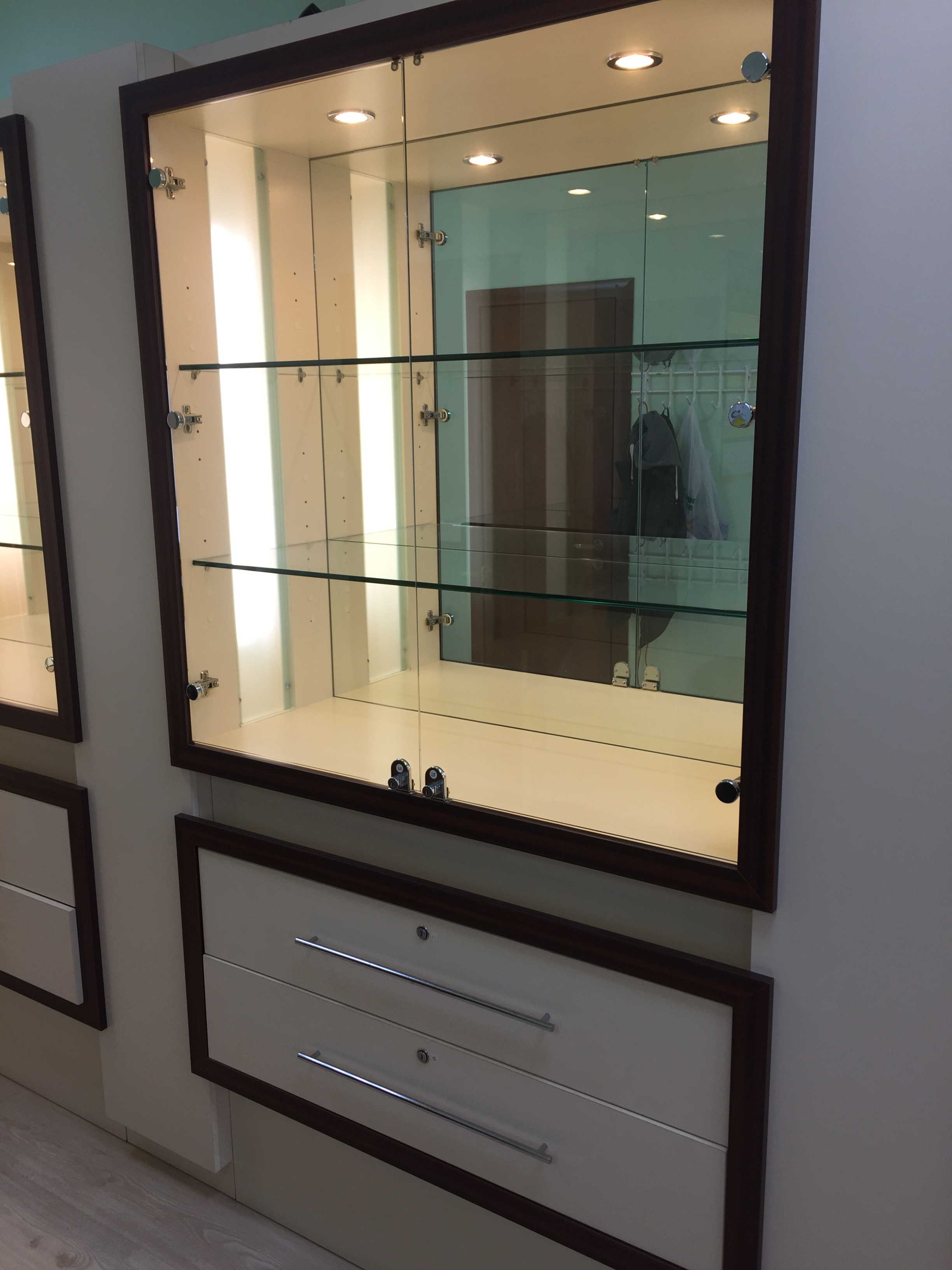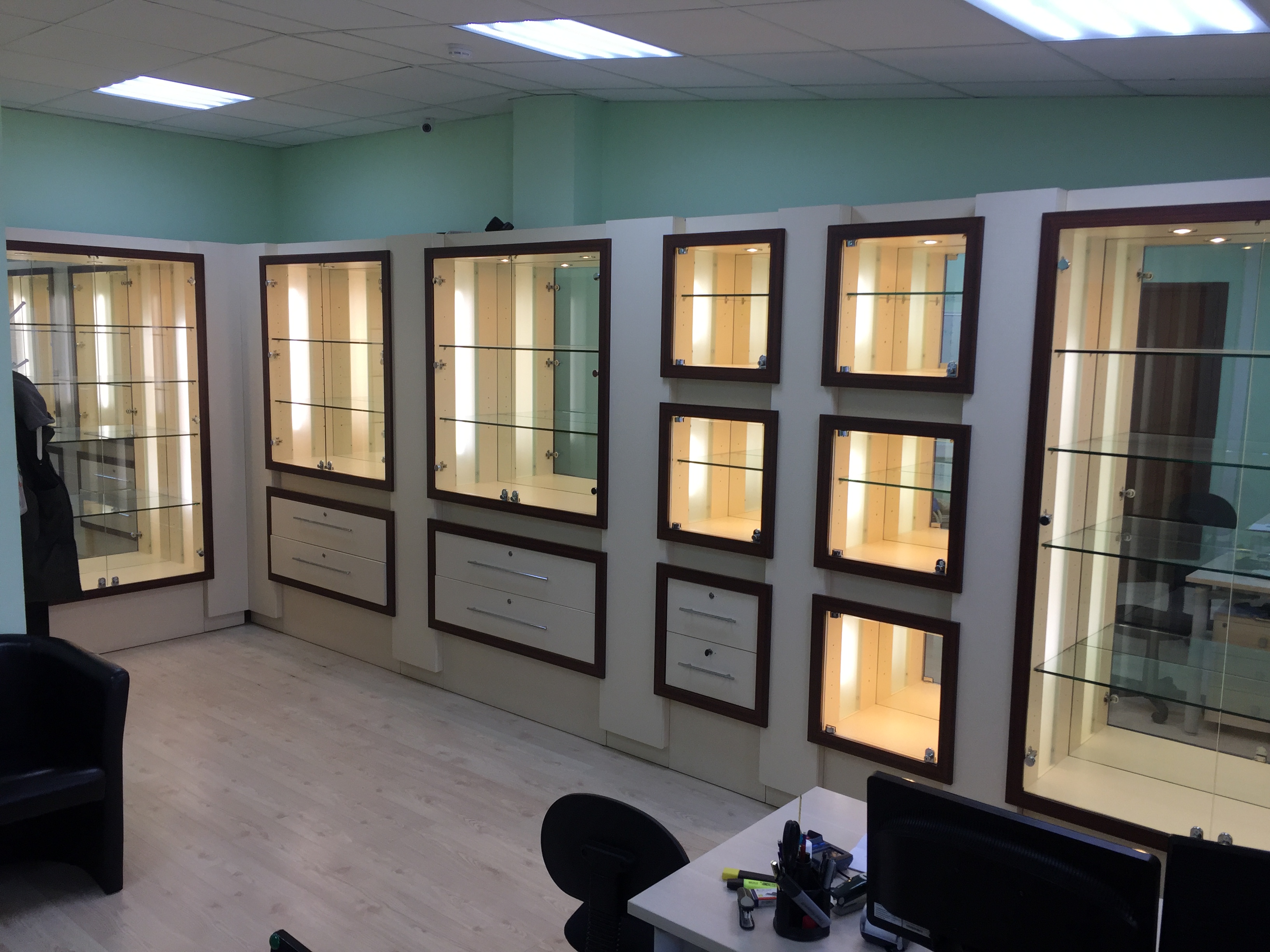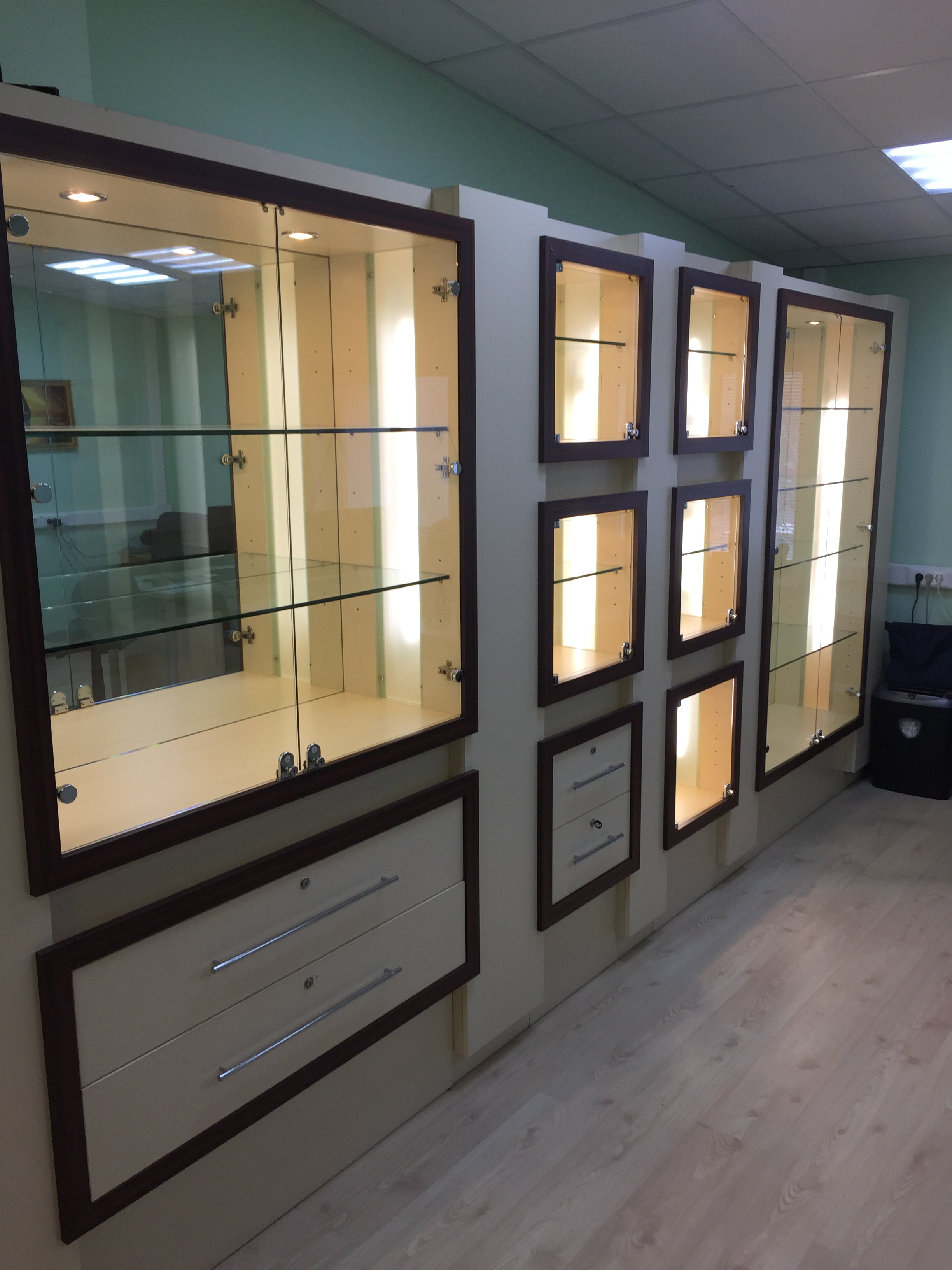 Продаю отличные витрины с подсветкой. 6 разнообразных модулей с ящиками и ключами. Разбираются до основного каркаса. Тяжелые. Высота 225, примерная ширина модуля около 140. Самовывоз в районе м. Пролетарская.