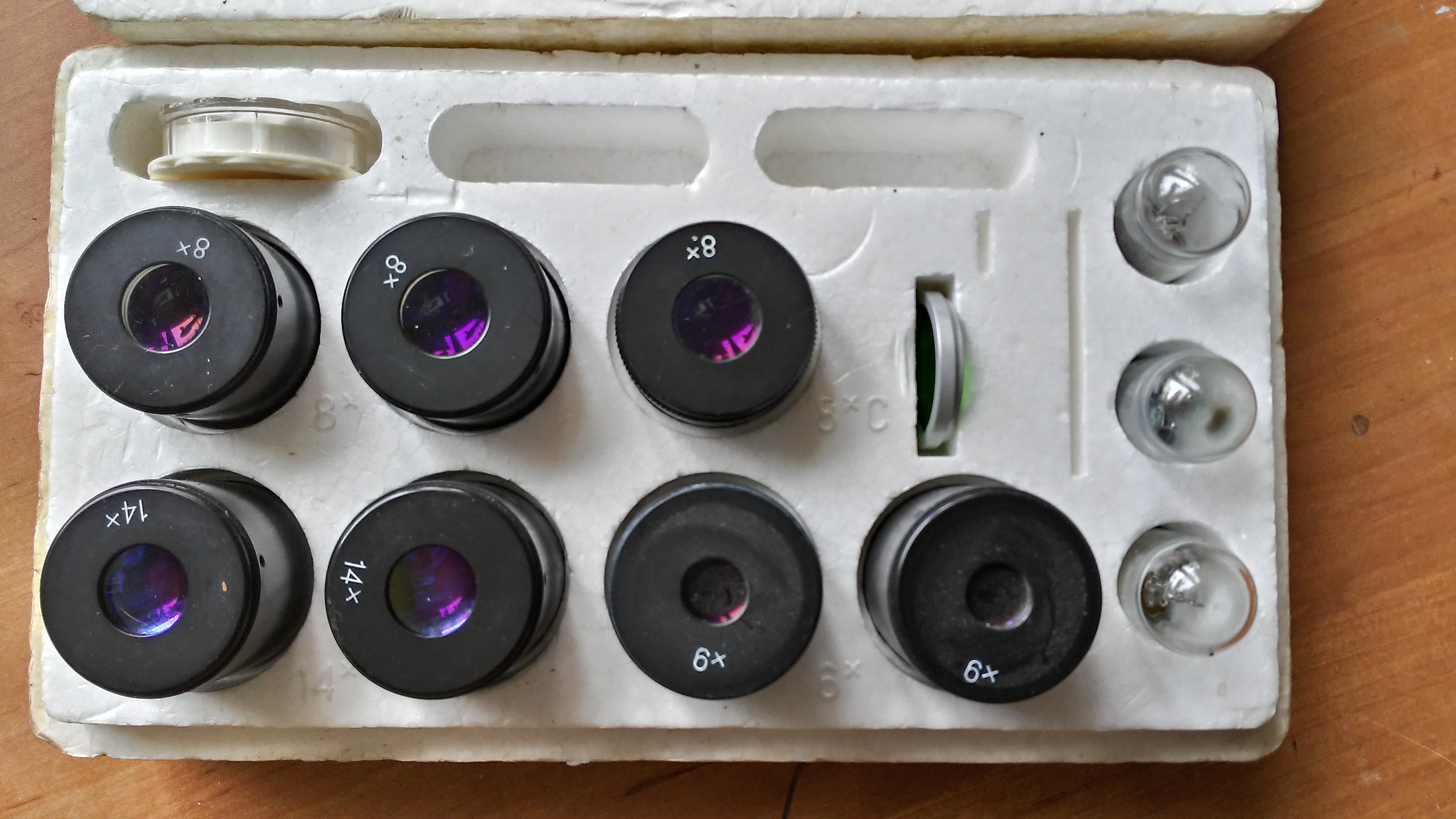 Есть: ЗИП, включающий в себя окуляры 6Х-2 шт., 8Х - 2 шт.,14Х - 2 шт.2 наглазника, линза светофильтра; механизм регулировки межзрачкового расстояния; подсветка с трансформатором и 3 запасные лампочки