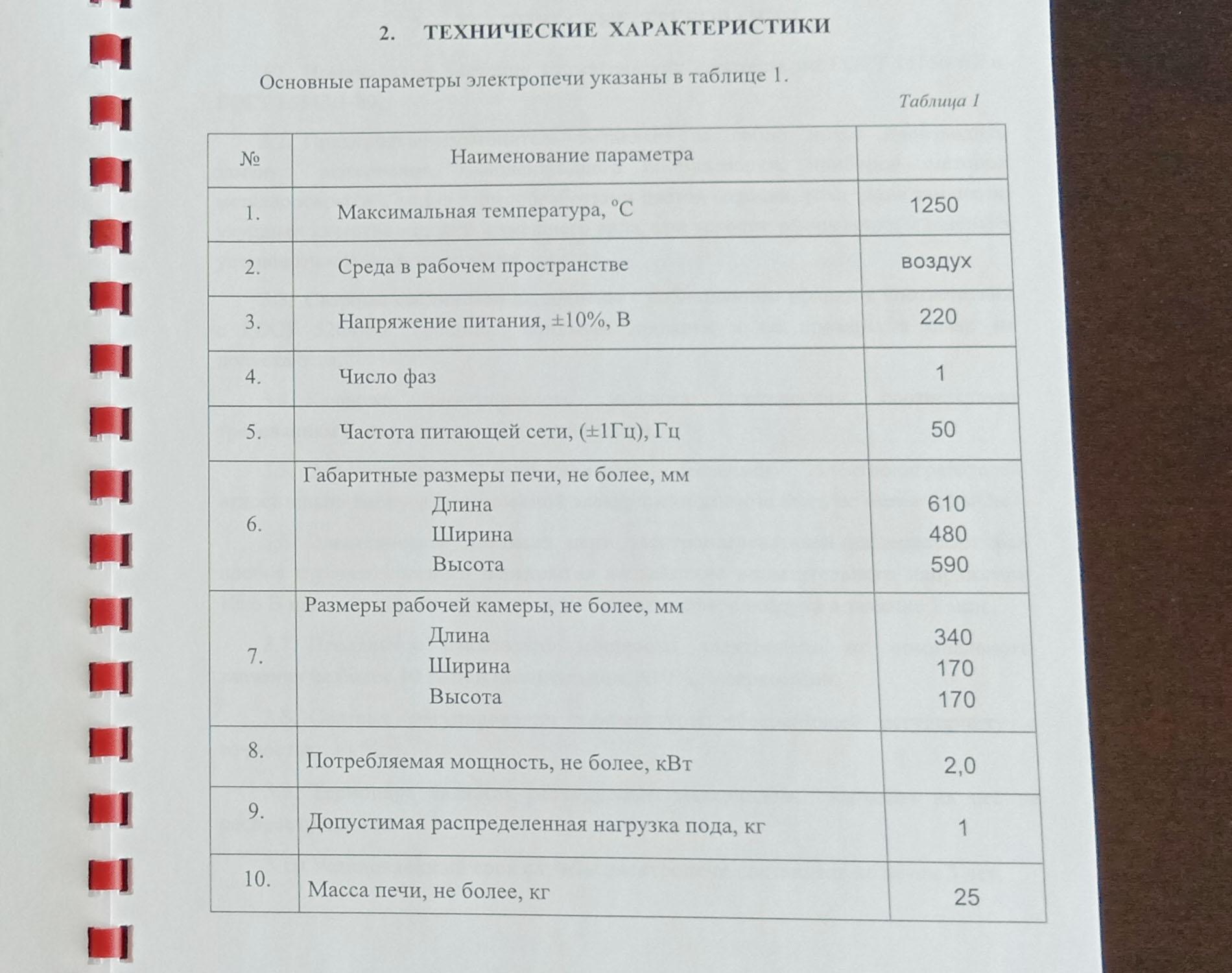 Напряжение 220 вольт, максимальная температура нагрева 1250 градусов.