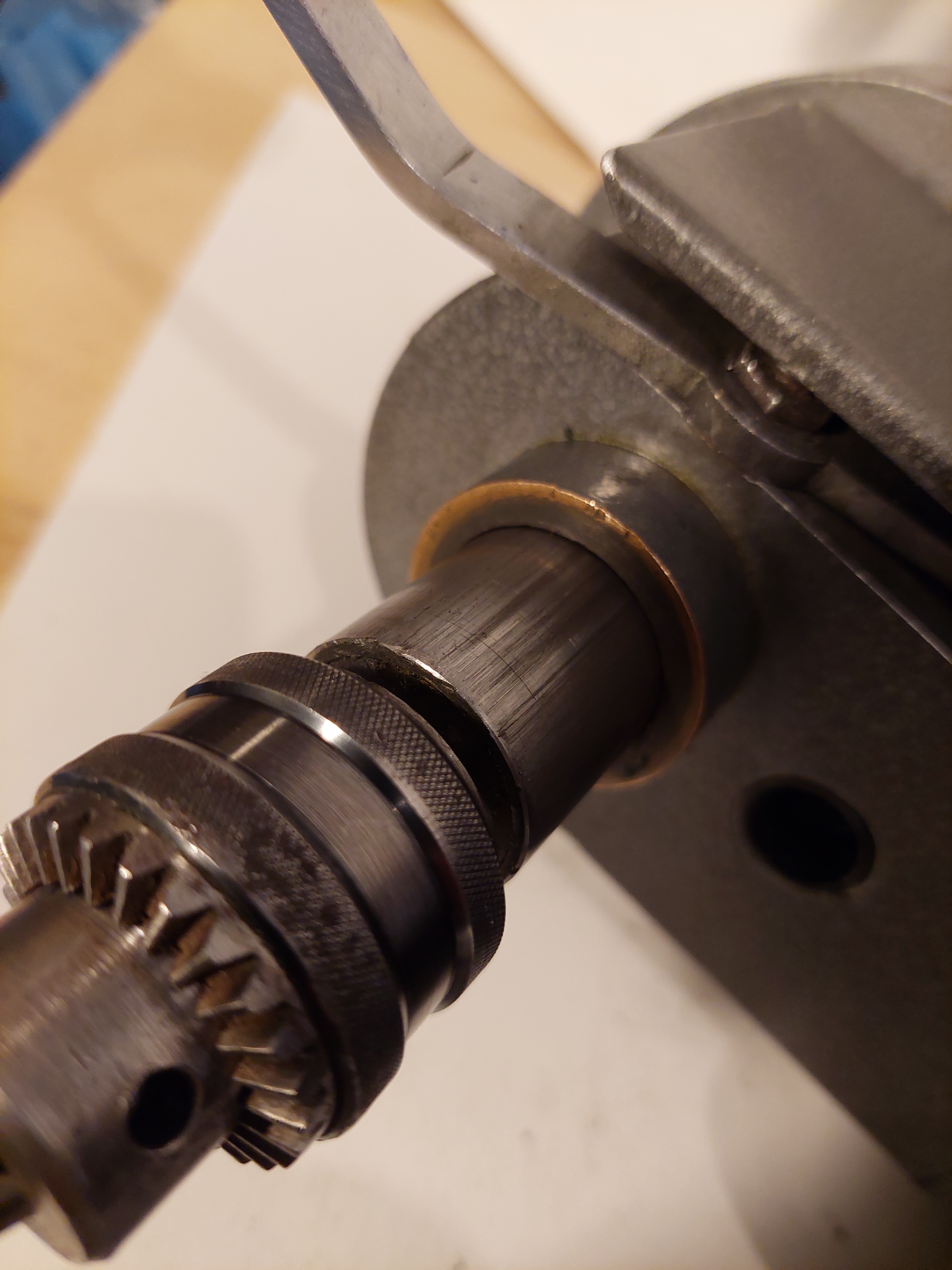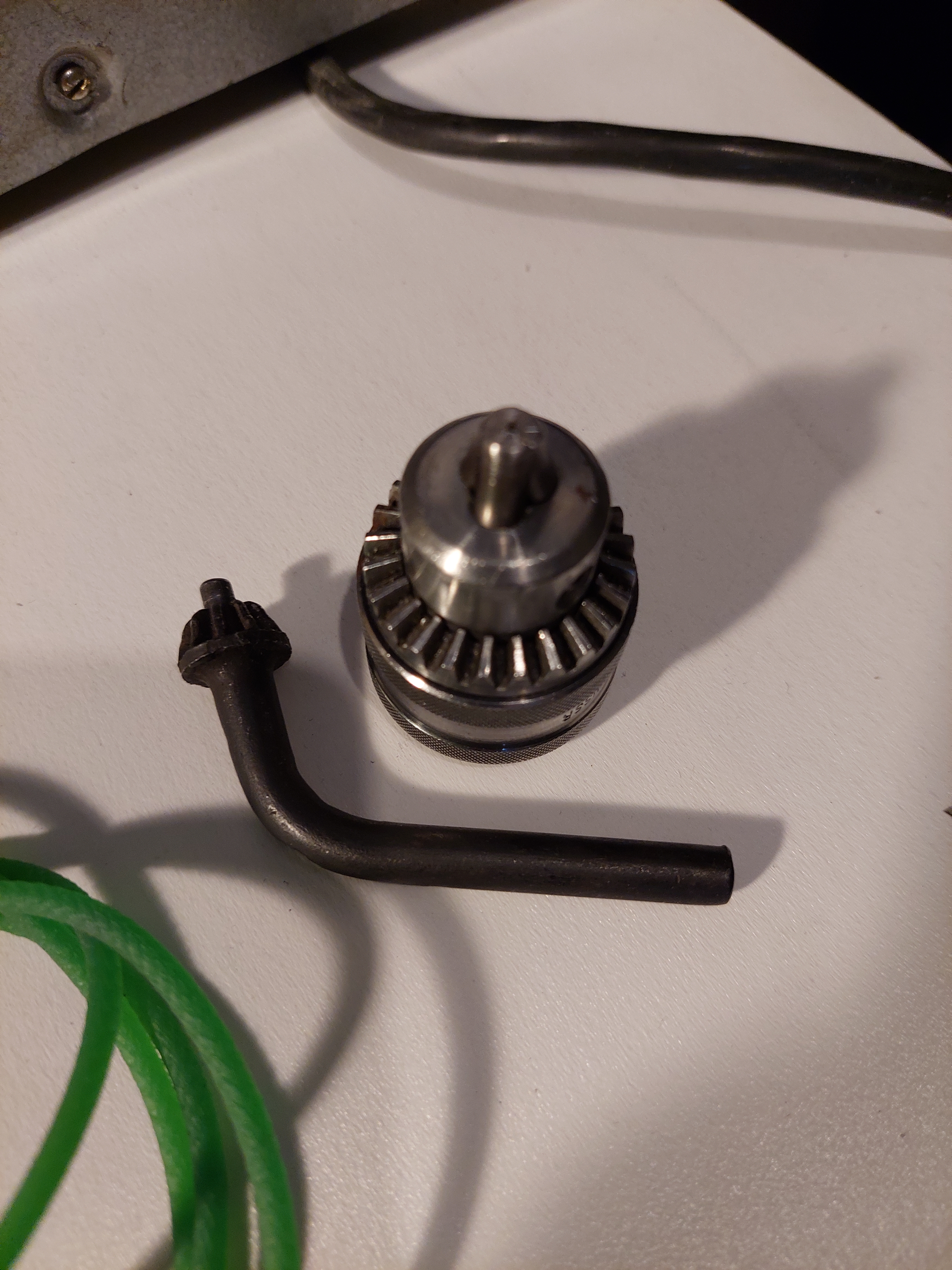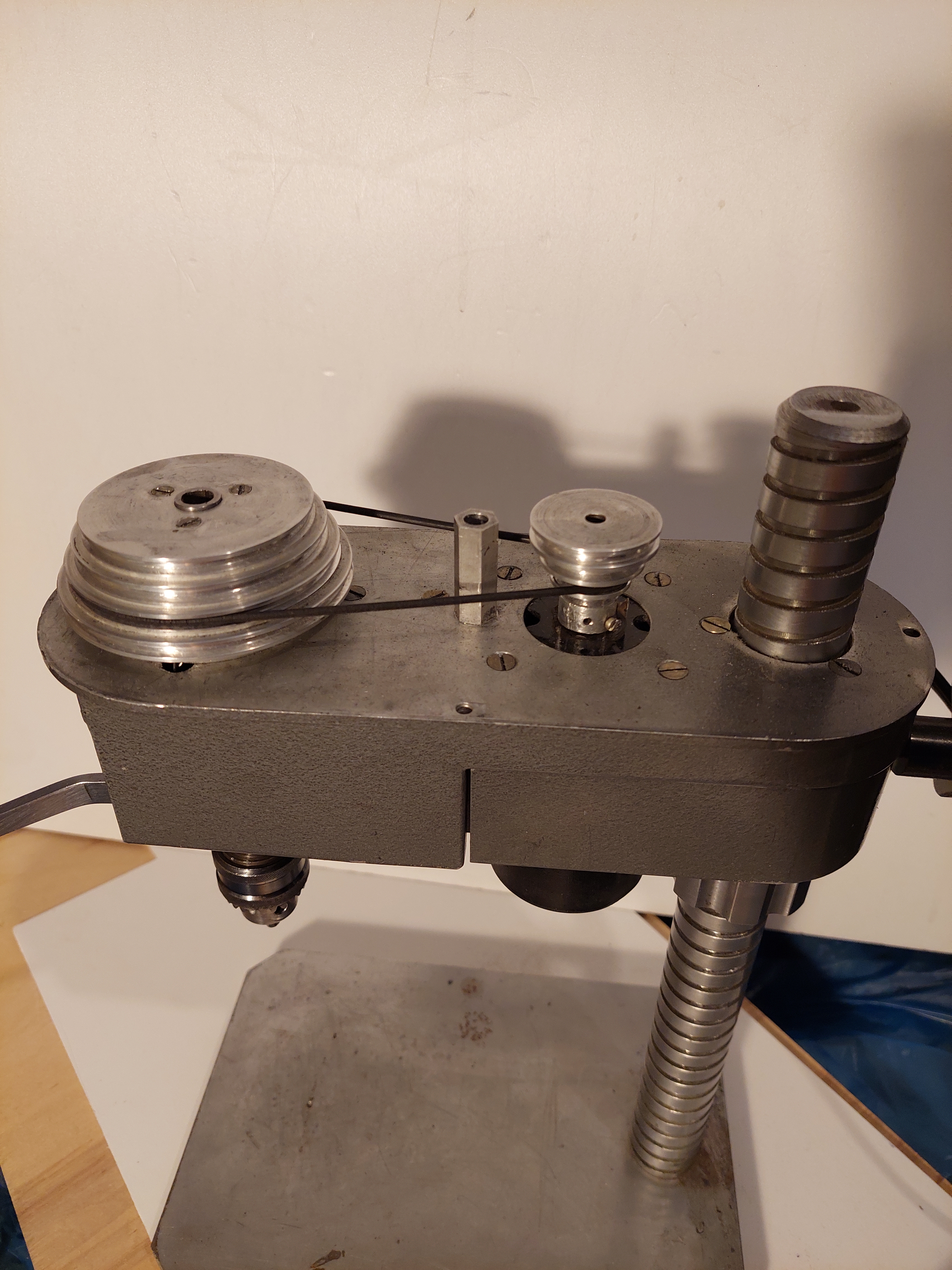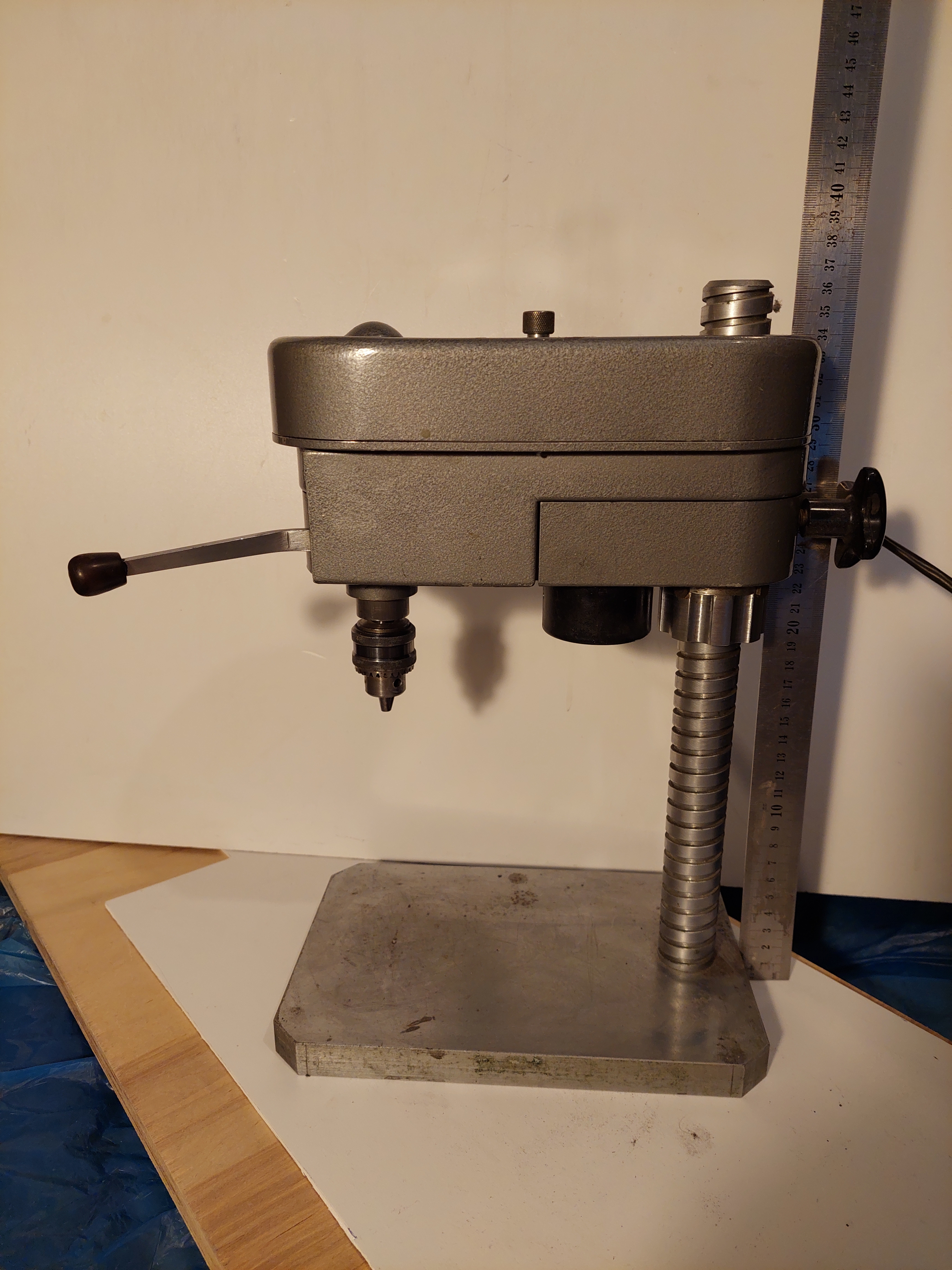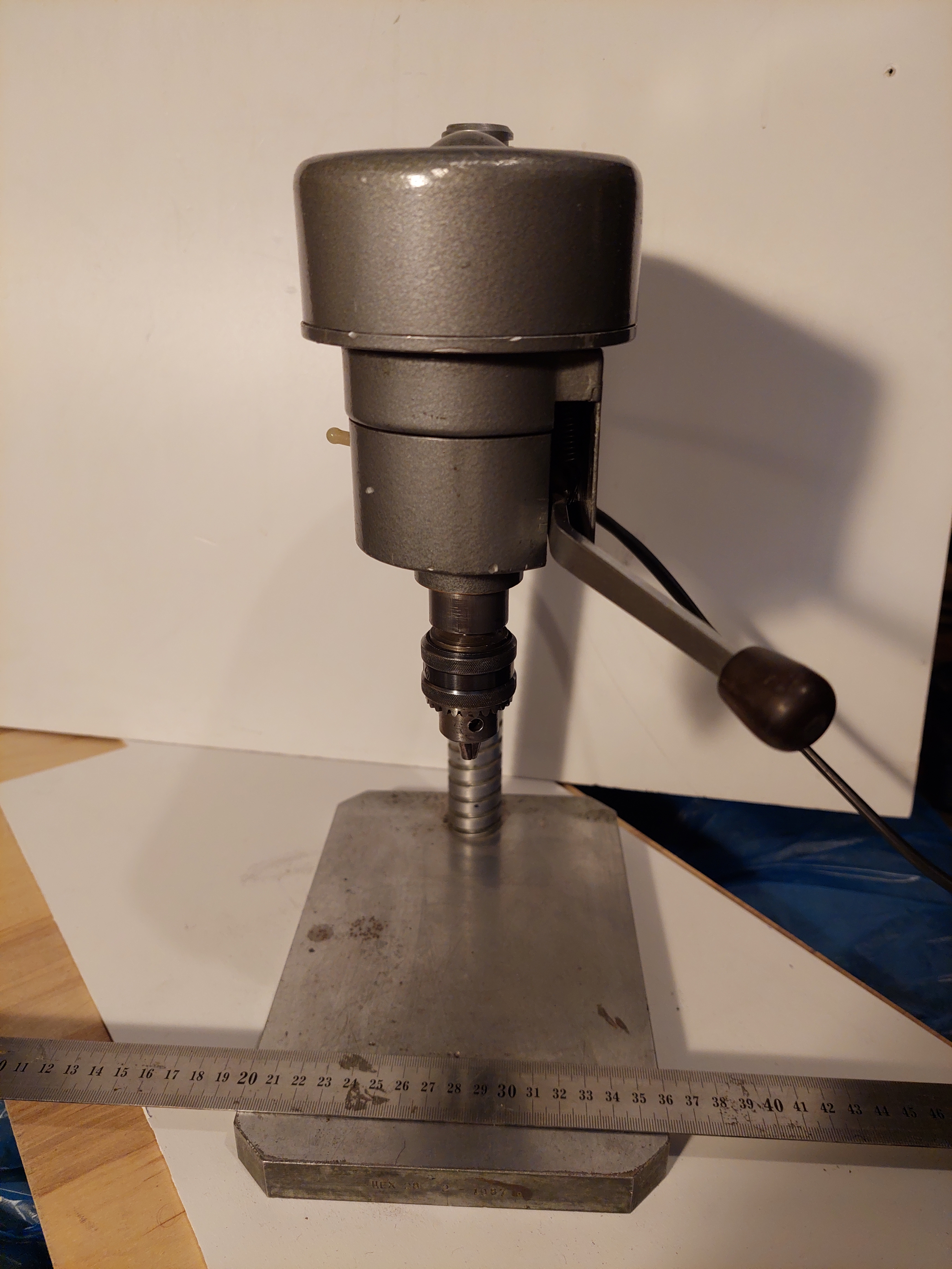 Маленький сверлильный станок. СССР. Внутризаводское изготовление. Маркировок и шильдиков нет. Очень качественно сделан, во всех парах трения латунь и сталь. Полноценная пиноль. Есть освещение зоны сверления, нужно вкрутить лампочку. Габариты основания 24 смХ16 см. Высота 37см. Вес станка 11,3 кг. Установлен патрон 1-6 В10, ключа к нему нет. Станок на 36 вольт, электромотор Д-25Г, к сети 220в подключен через трансформатор. Со станком отдается трансформатор 220Х36В, приводной ремень, патрон 0,8-6мм с ключом. Станок в Питере. Денег 10тр.
