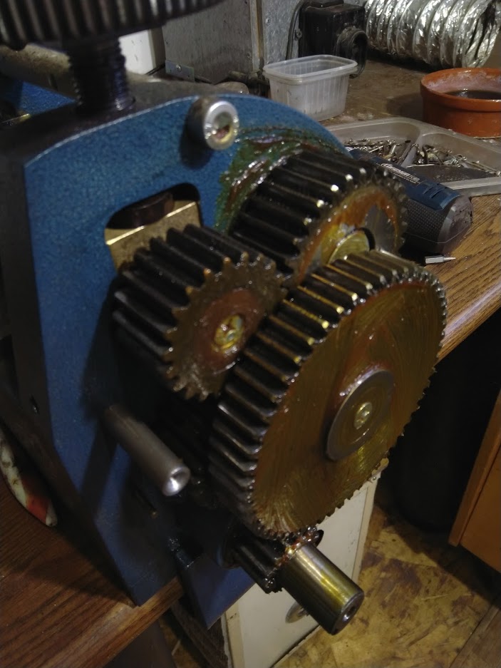Как говорится сила есть - ума не надо, я прокатывал пластины нейзильбера, и решив сэкономить на времени стал больше чем на один оборот прижимать валы.. получилось очень туго, я экспериментировал до каких пор возможно... и так что я даже не смог провернуть, лист металла я назад выкрутил и всё. далее особо не замечал, это был последний лист. а сегодня снова нужно было прокатать металл, а вал не поднимается как положено. Знаю что лучшее враг хорошего, ну вот так получилось.